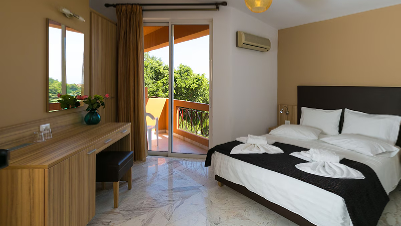 Værelserne på Elotia Hotel varierer lidt i størrelse og indretning, men fælles for dem alle er eget badeværelse, aircondition, TV, gratis wi-fi, telefon og køleskab. Der er adgang til enten balkon eller terrasse.